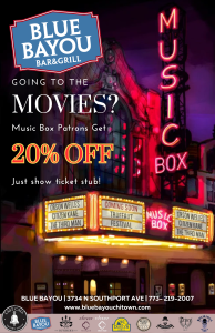 Catching a film at the iconic Music Box Theatre? Make your night even more unforgettable by stopping at Blue Bayou Bar & Grill, just down the street! Show your Music Box ticket stub and get 20% off your entire bill—because good taste shouldn’t end with the credits.
