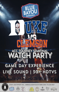 The ACC Tournament heats up at Blue Bayou with a semifinal showdown between Duke and Clemson. Grab your crew and settle in for a full game-day experience with live sound, 30+ HDTVs, and all the tournament drama on display.