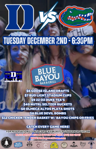 It’s Duke vs Florida under the lights, and Blue Bayou is turning game night into a full-blown Blue Devils takeover! Grab your seat, grab your cup, and enjoy all the drink specials your game-day spirit deserves.