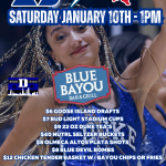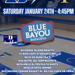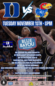 The Blue Devils take on the Jayhawks, and Blue Bayou is where Duke Nation comes to play! Catch every bucket, dunk, and deep three with wall-to-wall TVs, cold drafts, and game-night energy that can’t be matched.