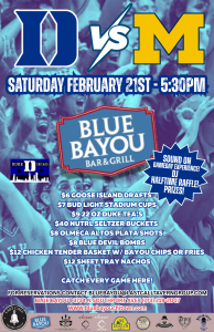 College hoops gets serious when Duke takes on Michigan — and there’s only one place in Chicago to catch it the right way. Join us at Blue Bayou Bar & Grill for a full-on gameday experience with sound on, a packed house, and Blue Devil energy from tip-off to final buzzer.