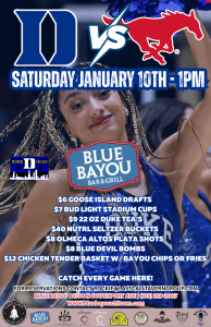 Blue Bayou is the place to be as Duke takes on SMU in a Saturday showdown! Get loud, get blue, and enjoy all your favorite game-day drinks and bites while you cheer on the Blue Devils with the Chicago Duke crew.