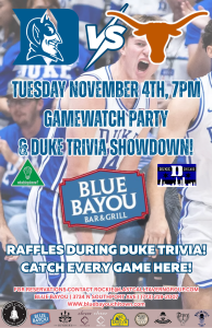 Blue Bayou is tipping off Duke Basketball season with a Gamewatch Party and Duke Trivia Showdown! Cheer on the Blue Devils as they take on Texas, and test your knowledge between plays with Duke-themed trivia hosted by Whaddayaknow?