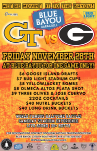 Blue Bayou becomes Yellow Jacket territory for one game only — and this rivalry matchup is going to be massive. We’re bringing the full Game Day Stadium Experience with loud sound, big energy, and all the drink specials your crew can handle. Whether you’re rolling with GT or riding with Georgia, this is the spot to catch every snap.