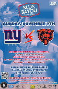 It’s an NFC clash right here in Wrigleyville! Watch the New York Giants take on the Chicago Bears at Blue Bayou Bar & Grill — your home for every hard hit, highlight, and touchdown.