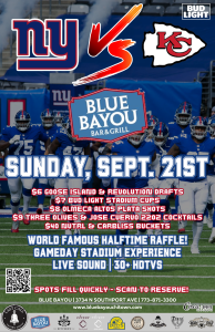 New York Giants fans—Blue Bayou is your Windy City watch bar for Big Blue glory! We’re bringing MetLife vibes straight to Southport with game day specials, 30+ HDTVs, and our World Famous Halftime Raffle.