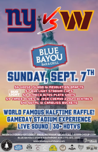 Big Blue is taking on Washington, and we’re turning Blue Bayou into Giants gameday central! Join us Sunday, September 7th, for a New York Giants watch party in Chicago complete with live sound, 30+ HDTVs, and a world-famous halftime raffle.