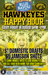 Hey Iowa fans—Blue Bayou is calling your name (and pouring you a drink). Join us every Friday in August from 5PM–7PM for Hawkeyes Happy Hour featuring $1 domestic drafts and $5 Jameson shots. It’s the perfect warm-up for football season and a great excuse to start your weekend early.