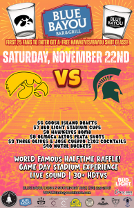 Get ready, Hawkeye fans — the final stretch of the season is here, and Blue Bayou Bar & Grill is your home turf for every big play. Catch Iowa vs Michigan State on Saturday, November 22nd, live with full stadium sound and nonstop energy.