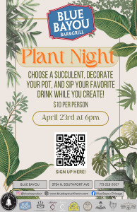 Looking for a midweek plan that’s a little more chill and a lot more charming? Head to Blue Bayou for Plant Night on April 23rd and enjoy an easygoing evening of succulents, sips, and creative fun.