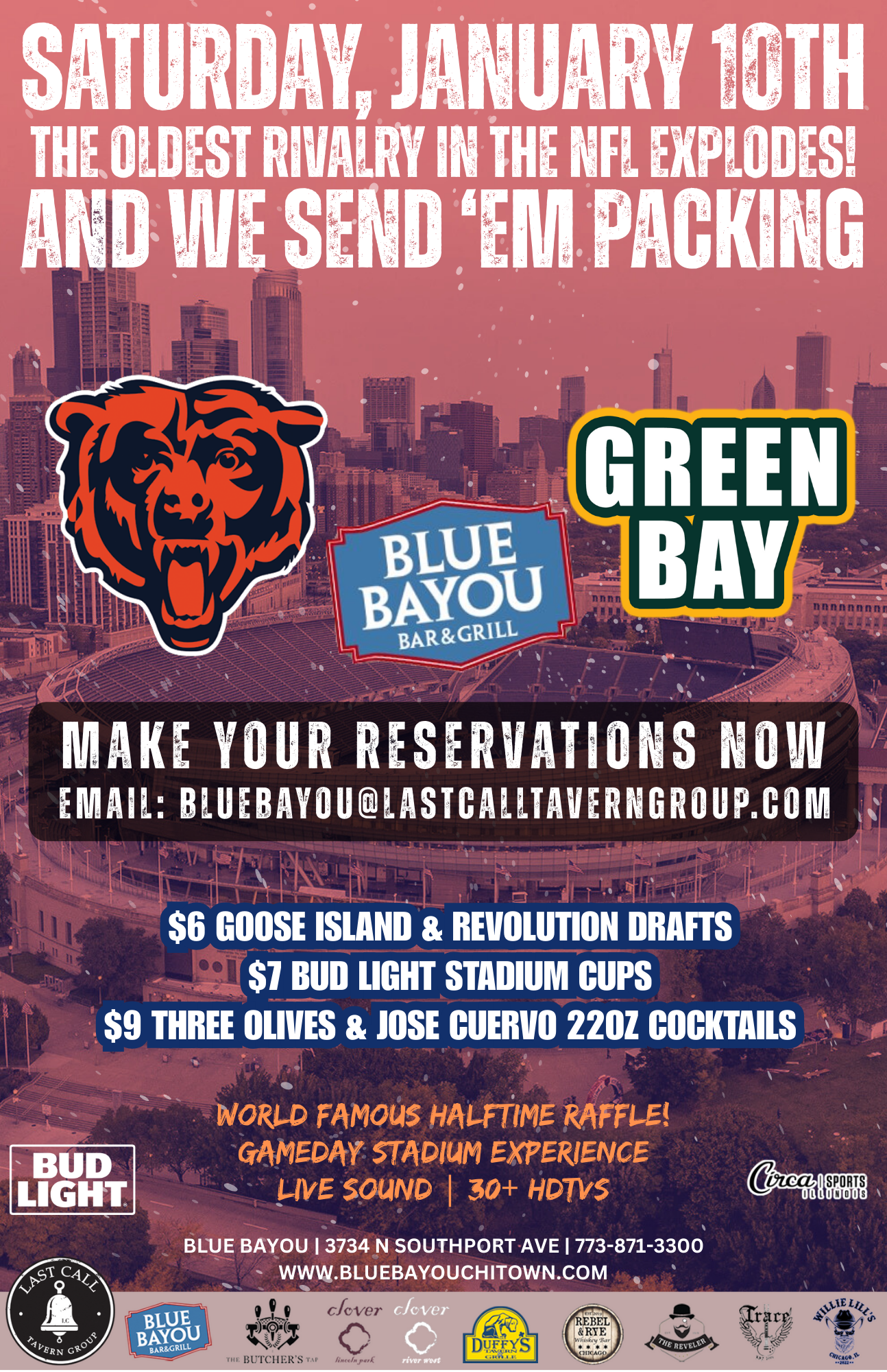 Blue Bayou is where Chicago football fans come to take this rivalry seriously. Join us for sound-on action, stadium-style specials, and a crowd that brings it from kickoff to final whistle.