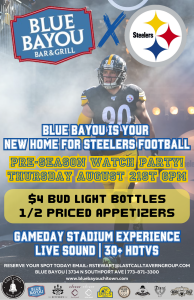 Join us at Blue Bayou Bar & Grill for the ultimate Steelers football watch party as we kick off pre-season with cold beer, loud fans, and wall-to-wall screens.
