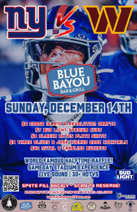 Get ready for a full-blown NFC East showdown as the Giants take on Washington! Blue Bayou is your stadium-away-from-the-stadium with unbeatable vibes, cold drinks, and game-day energy that hits different.