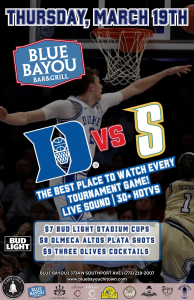 March basketball is here and the tournament action is heating up. Join us at Blue Bayou Bar & Grill as Duke takes on the Siena Saints in a must-watch matchup with the full game day stadium experience.